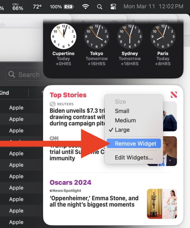 - Удалите все виджеты «Новости» с рабочего стола Mac: кликните по виджету правой кнопкой и выберите «Удалить виджет».