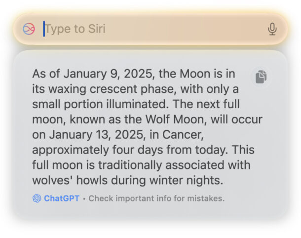 На скриншотах выше Siri смогла ответить на простой вопрос о насекомом, но когда её спросили о дате следующего полнолуния (эта информация есть в приложении «Погода» на Mac), она не смогла дать ответ без помощи ChatGPT.