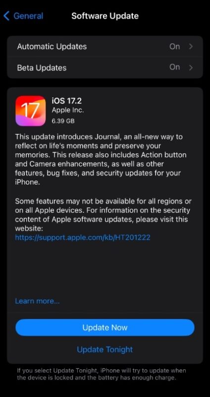 Заметьте, хоть это и все еще бета-канал, сами iOS 17.2 и iPadOS 17.2 больше не упоминают бета-версии, и обновления не помечены как 'релиз-кандидат'.
