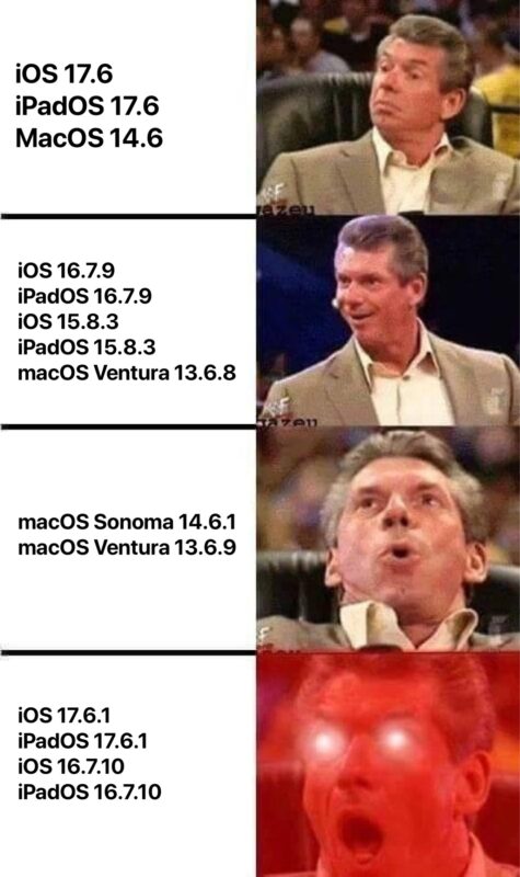Я знаю, о чем вы думаете: "Но у меня же Mac! И старый iPhone! И iPad прошлого поколения! Я тоже хочу обновления!" Может, вы даже начинаете нервничать от одной мысли, что вашим устройствам не достанутся новые версии ПО. Не расстраивайтесь. Поверьте, для них тоже приготовили горяченькие апдейты. Под звуки фанфар встречайте macOS Sonoma 14.6.1 и macOS Ventura 13.6.9. А владельцам более старых iPhone и iPad, которые жаждут обновлений, ребята из Купертино приготовили свежайшую партию iOS 16.7.10 и iPadOS 16.7.10.