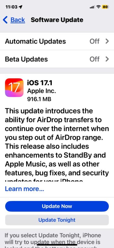 - Нажмите для установки iOS 17.1 или iPadOS 17.1 - в зависимости от вашего устройства.