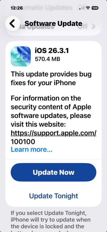 - Нажмите «Обновить сейчас», чтобы скачать и установить iOS 26.3.1 на iPhone или iPadOS 26.3.1 на iPad.