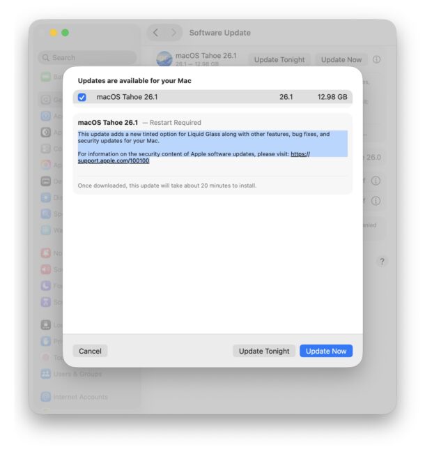 Список изменений для macOS Tahoe 26.1 довольно короткий и не упоминает конкретных исправлений. Вот что там пишут: