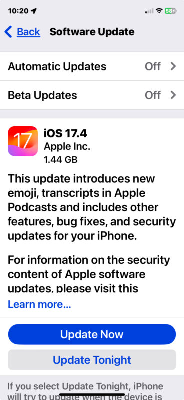 - Choose to “Update Now” for iOS 17.4 / iPadOS 17.4 to start the download and update process