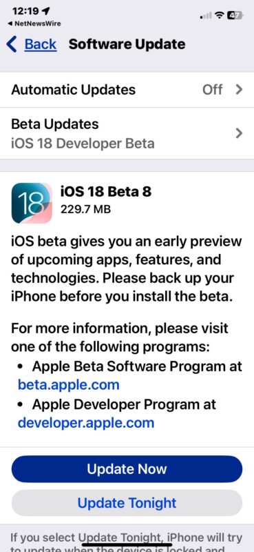 - Нажмите «Обновить сейчас», чтобы скачать и установить iOS 18 beta 8 или iPadOS 18 beta 8.